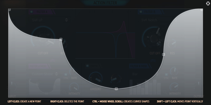 高度なモジュレーション・システム Action Filterは非常に強力なツール・キットを備えています。カスタム・シェイプのエンベロープ・フォロワー、5つの波形を持つLFO、32ステップ・シーケンサーの3つのモジュレーション・ソースがあり、各モジュレーション・ソースはイン・シンクまたはフリー・シンク・モードを割り当てることができます。