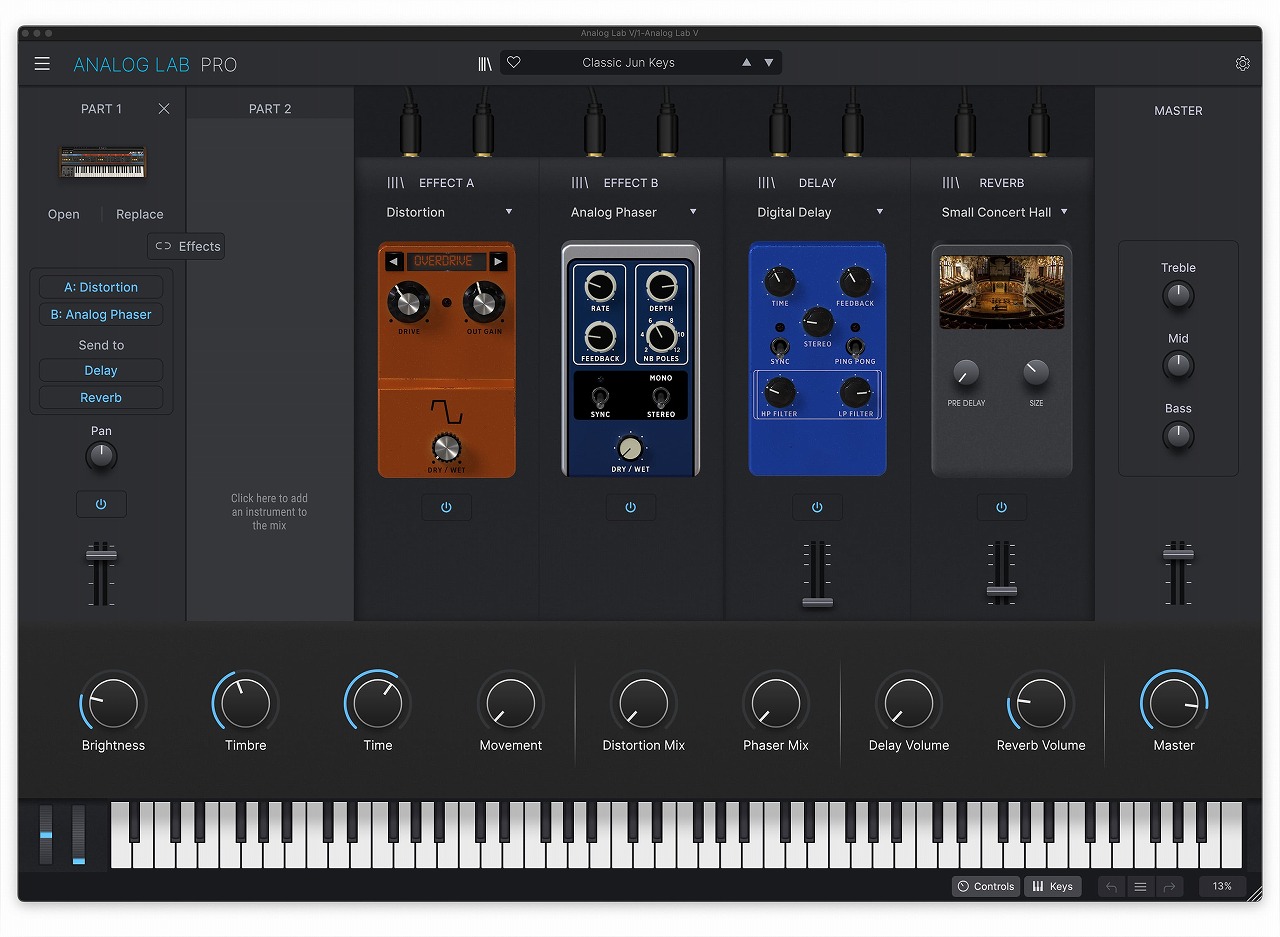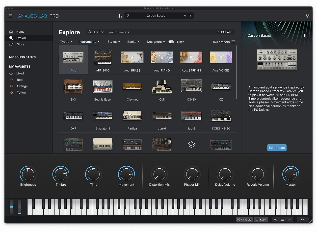 受賞歴のある V Collection、Pigments などから選ばれたピアノ、オルガン、アナログおよびデジタル シンセサイザーを探索してください。