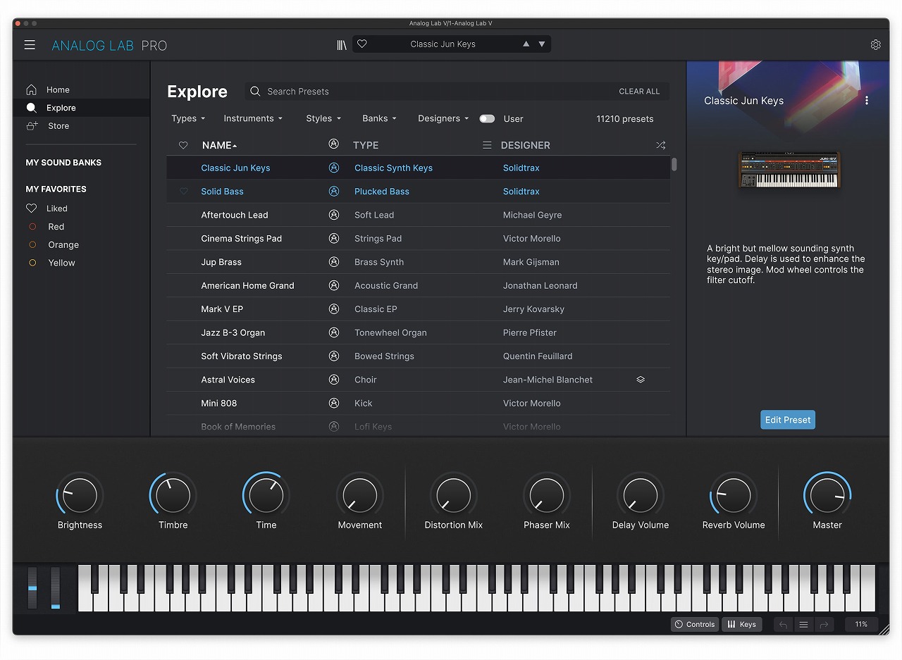 Analog Lab Vは、時代を超越したインストゥルメントの数々にまたがる数千種類ものワールドクラスのプリセット、即座にアクセスできるコントロール、完璧な統合をワンストップにまとめたプラグインです。