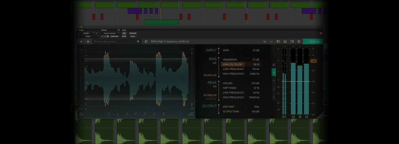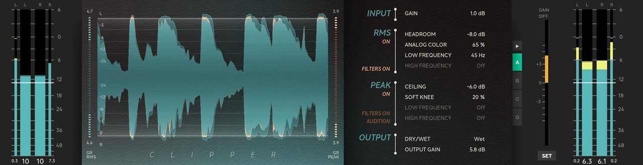 デュアルクリッピング ステージ RMSとPeak、アナログ カラーオプション、最適化されたソフト ニー機能を備えた Clipper は、分析的でありながら雰囲気のあるサウンドを実現します。
