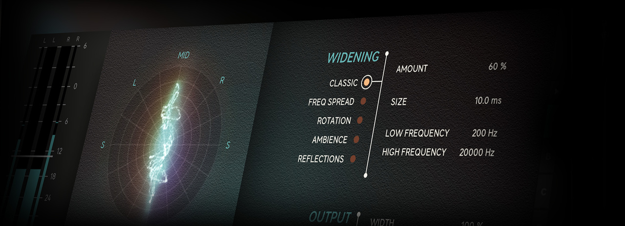Widener を使用すると、モノラル トラックからステレオ信号を作成したり、5 つの独自の拡張アルゴリズムを使用して既存のステレオ トラックを拡張したりできます。