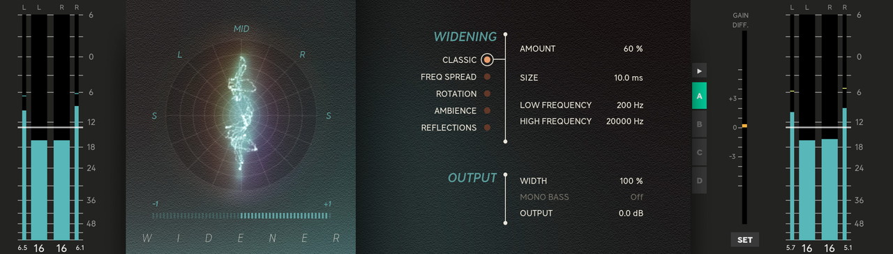 そのため、クラシック、周波数拡散、回転、アンビエンス、反射の 5 つの異なるアルゴリズムが含まれています。各アルゴリズムには独自の長所があり、ステレオ イメージのスイート スポットを見つけて、不要なアーティファクトを最小限に抑えることができます。