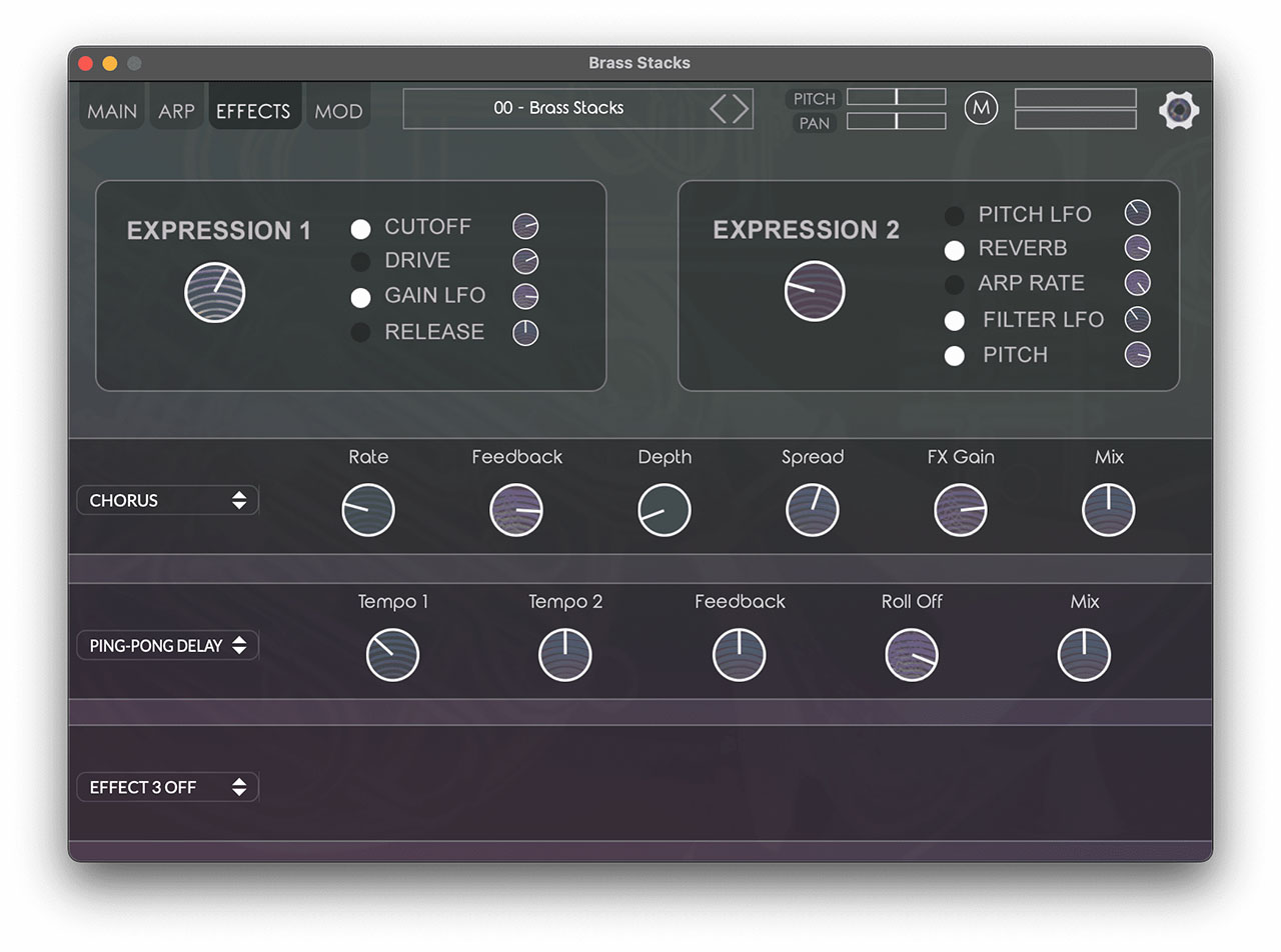 すべてのプラグインにはアルペジエーターとメロディービルダーがあり、実際には再現できないかもしれないサウンドの演奏にする手助けにもなります。