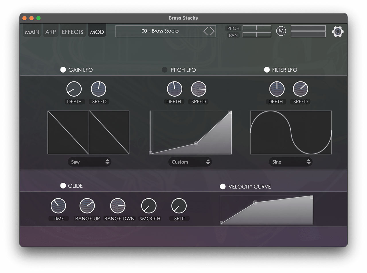 - 6 つの形状オプションを備えた 3 つの LFO (ゲイン LFO、ピッチ LFO、フィルター LFO)