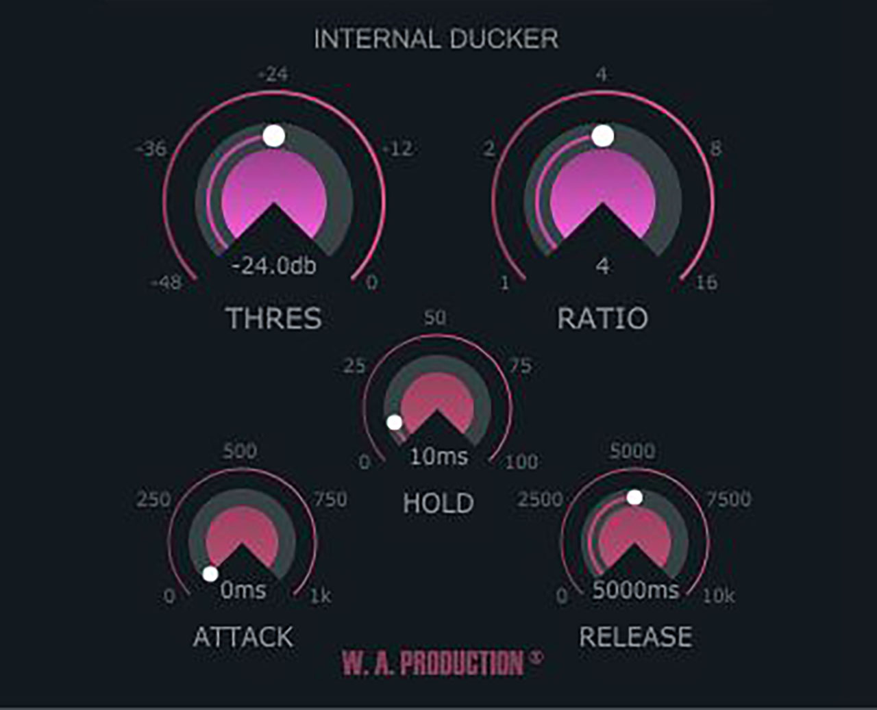 インターフェイスのダッキングセクションは標準のコンプレッサーと同様に機能し、スレッショルドとレシオのダイヤルはダッキングされた信号の処理方法を形成するための主なコントロールです。