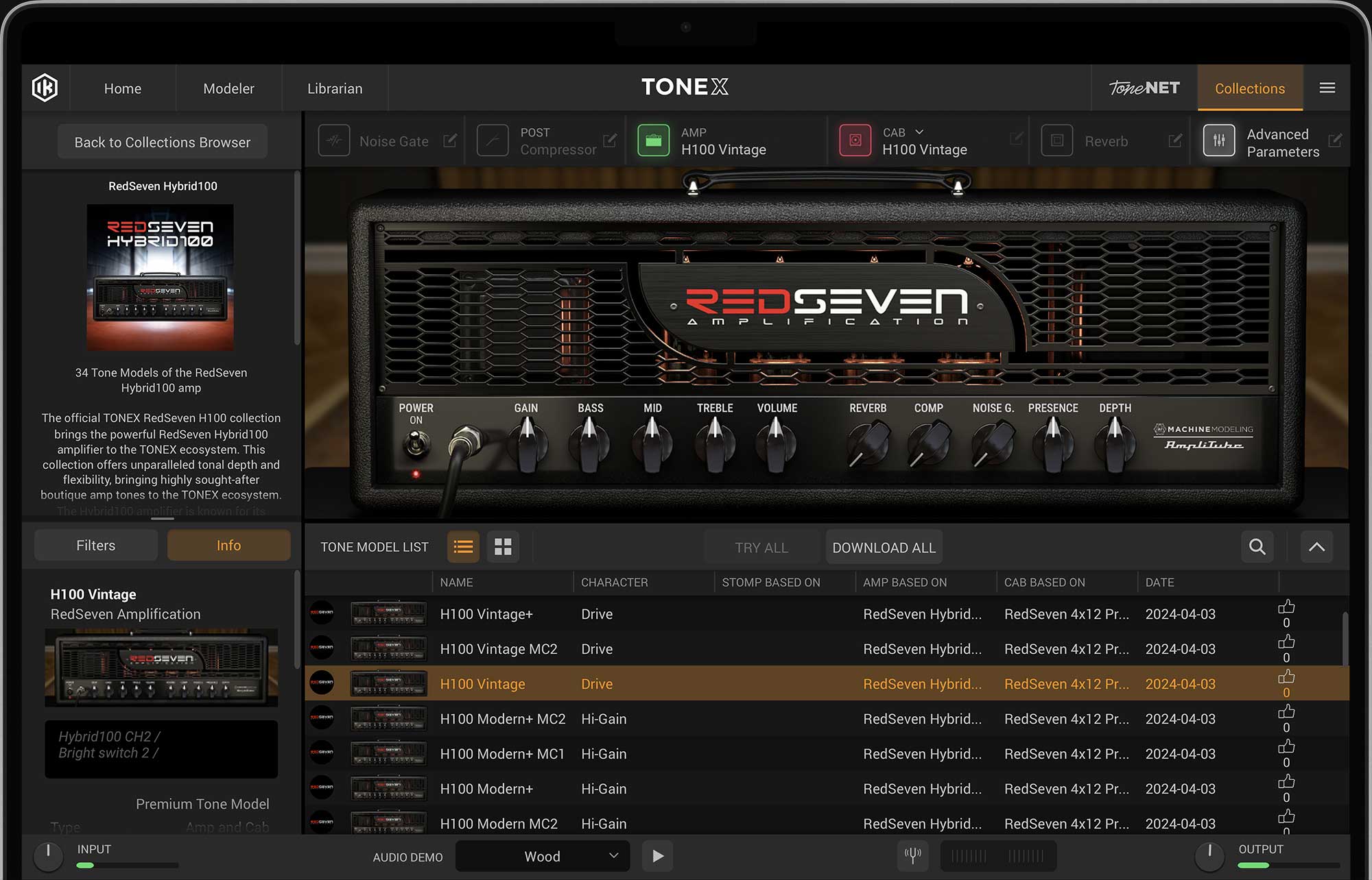 60年代スタイルの美しいクリーン・トーンからアグレッシブなハイゲイン・トーンまで、イタリアのアンプメーカー RedSeven のHybrid100アンプ からキャプチャーした、34種の Tone Modelを収録しています。全3チャンネルのトーン、ミッド・カット・セッティング、リード・ブースト、ヴィンテージとモダンのボイシングなど、Hybrid100のトーン・レンジを余すところなく再現します。また、本コレクションには、Amp/Amp+ Cab の両方の Tone Model が収録され、キャビネットには、Celestion Vintage 30を搭載した RedSeven4x12 ProCab が採用され、パンチと明瞭さを実現しています。
