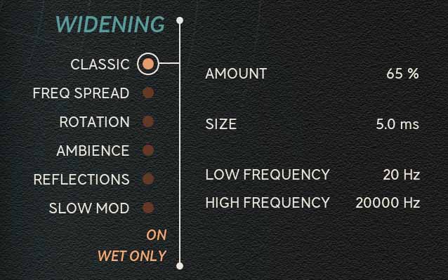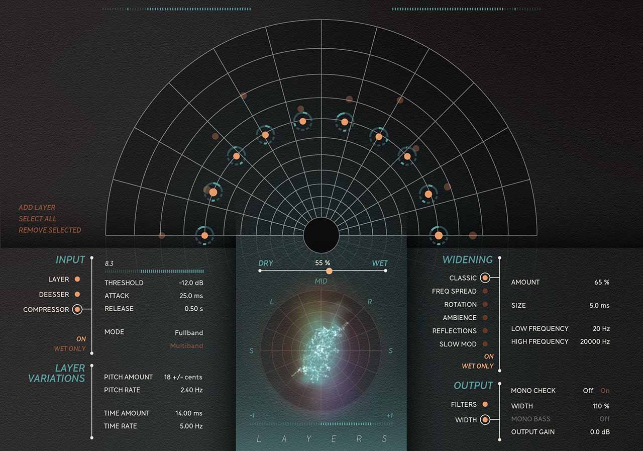 Layers は、人気の Widener プラグインから移植された、Classic、Frequency Spread、Rotation、Ambience、Reflections などのワールドクラスのワイドニング アルゴリズムを提供します。