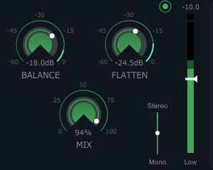 フラット ダイヤルはよりアグレッシブなコンプレッサーで、非常に弾むようなベース ラインや、ダイナミック レンジの広いアコースティック素材のダイナミクスを均一にするために使用されます。