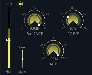 バランス ダイヤルを使用して、穏やかな圧縮を導入し、ドライブ ダイヤルを使用して、サウンドに少し (またはかなり) のざらつきを加えます。