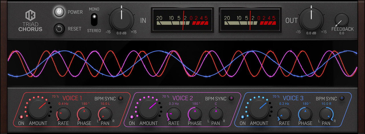 Triad Chorus にはフィードバック・コントロールも搭載されており、処理された信号をループさせることで、サウンドをより深く、複雑にすることが可能です。レゾナンス、渦巻くエコー、生々しく変化するテクスチャーを楽しむことができます。