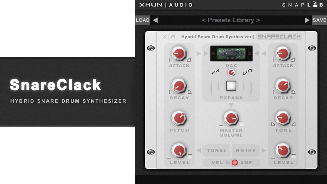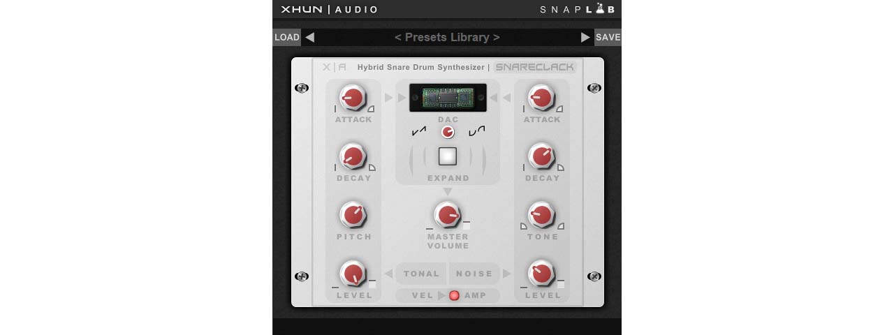 SnareClackは、その中心に、本物の 16 ビット整数精度デジタル合成技術 (90 年代後半のハードウェア デバイスで広く使用) と、飽和制御を備えたモデル化された DAC (デジタル アナログ コンバーター) 回路を使用しています。最後に、内蔵のステレオ エクスパンダー回路により、SnareClack は、EDM、テクノ、トランス、アンビエント ミュージックなど、さまざまな用途で、きびきびとした大きな電子ドラム スネアを生成できる自己完結型デバイスとなっています。