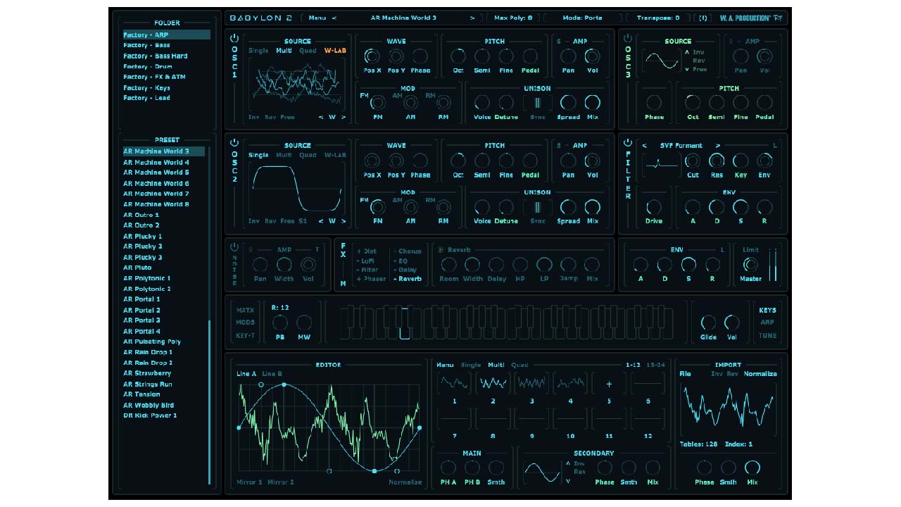 新しい W-Lab ウェーブテーブル エディターは、定義済みの波形に限定されず、ユニークなトーンや変化する音色の作成に役立ちます。独自の WAV ファイルを簡単に作成、変更、インポートできるため、比類のない創造の自由度で、未知の音響領域を探索できます。