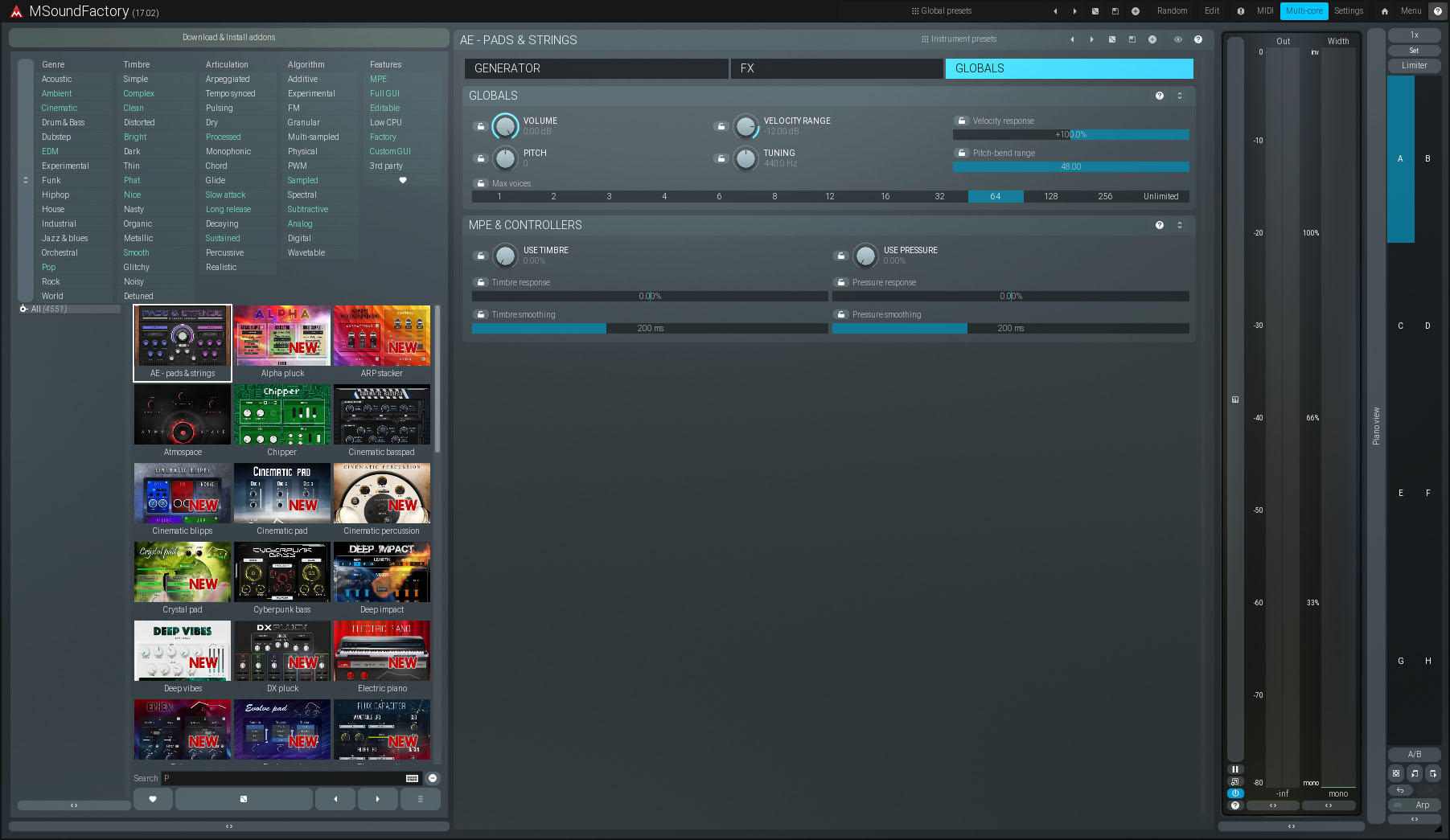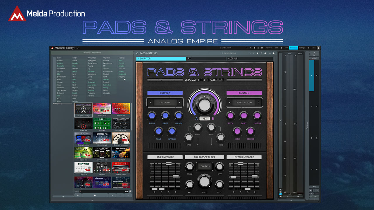 MSoundFactory または MSoundFactoryLE をすでにお持ちの場合は、Analog Empire: Pads & Strings は 完全に無料でダウンロードできます。MPluginManager を実行して実行するだけです。ただし、別途購入して、MSoundFactory の無料バージョンである MSoundFactory Player と一緒に使用することもできます。