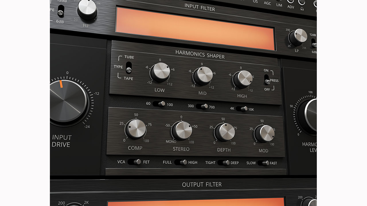 EQ とフィルタリングにより、倍音をシェイプして形作ることができるため、必要な場所に倍音を配置し、不要な場所には配置しないようにすることができます。さらに、倍音を圧縮することで、ピーク レベルをあまり追加せずに、より多くの倍音をドライ信号に混ぜることができます。