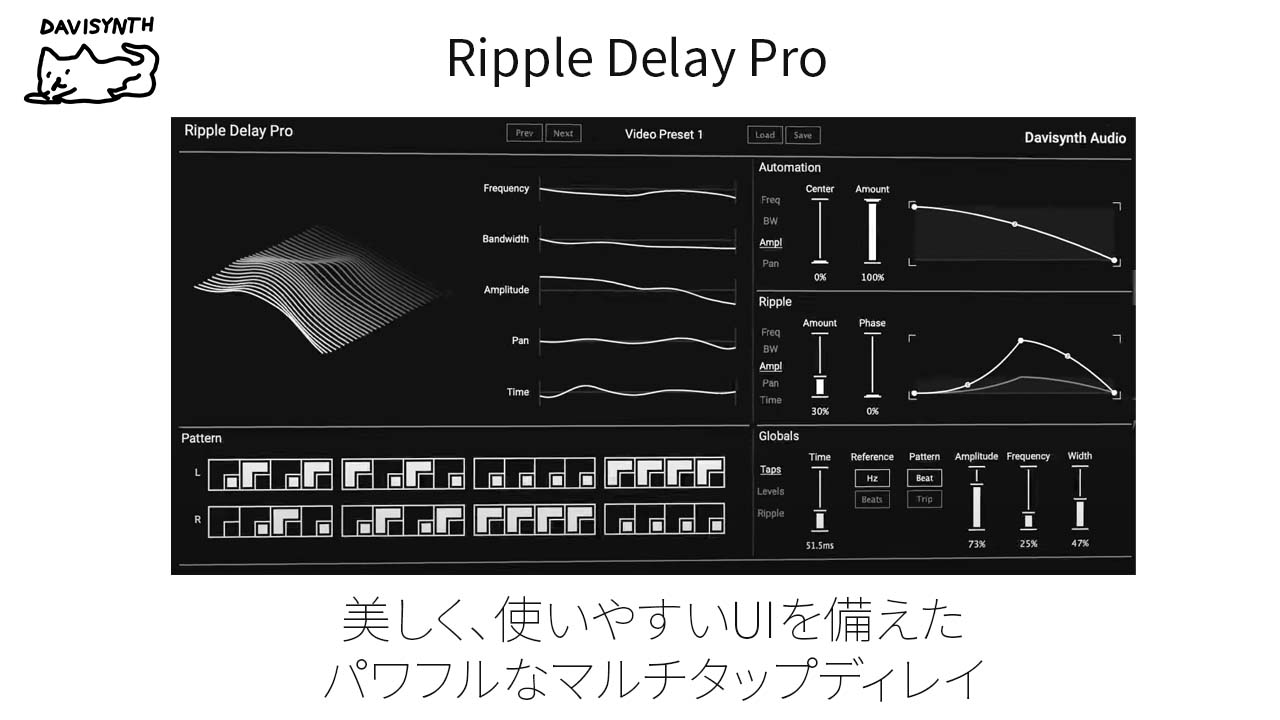 Ripple Delayは、美しくユーザーフレンドリーなインターフェイスを持つ、機能豊富なマルチタップ・ディレイ・プラグインです。同社のSpiral Delayのアルゴリズムをベースに、新しいインターフェースとサウンドのカスタマイズ機能を搭載しています。