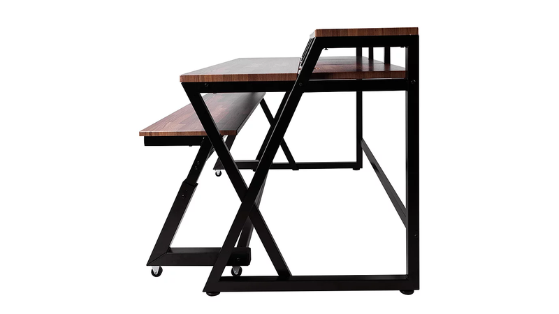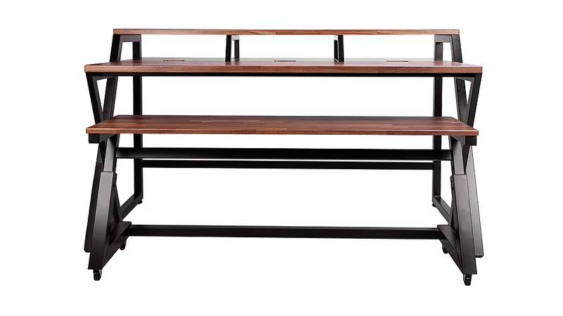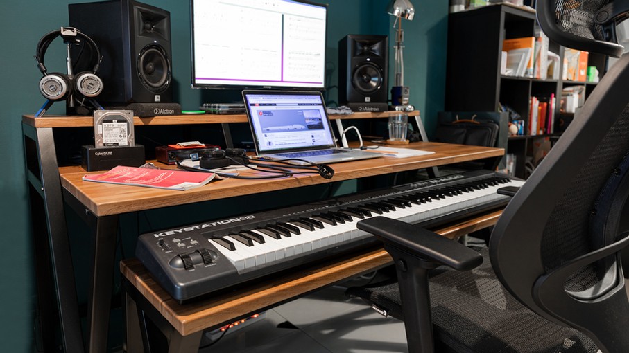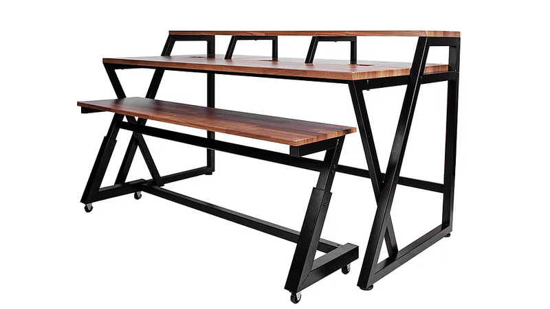 モニタースピーカー、17インチのラップトップ、レコーディング・ツールキットなどを適切に配置されるよう設計されたスタジオ・デスクです。独立型のキーボードスタンドは、お持ちの 88 鍵盤のスイートホームとなります。