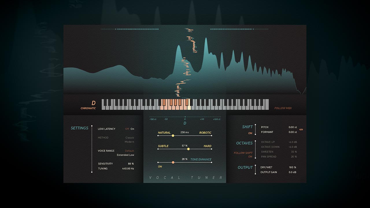 いくつかの簡単なダイヤルイン コントロールの背後には、ボーカルを微調整する機能があります (必要に応じてリアルタイムで)。または、完全なハード チューンを実行して、ピッチとフォルマントの移動、オクターブの上下、トーン エンハンス スライダーなどの多彩なエフェクトを追加することもできます。
