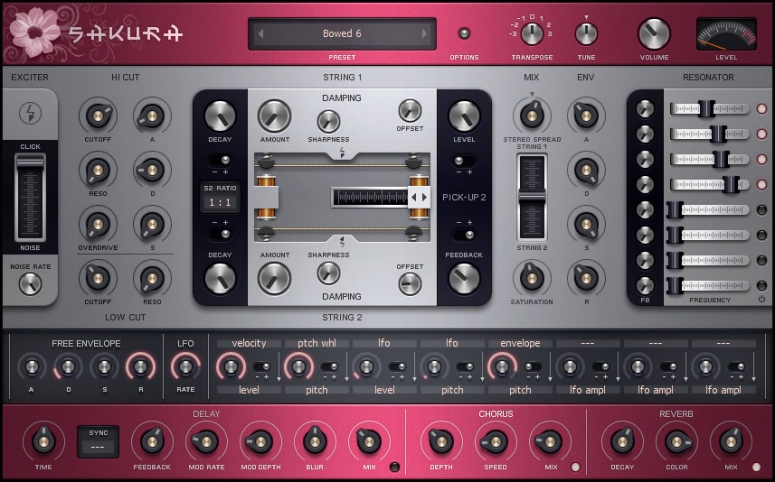 Vibration - Sakura のデュアルストリングモデルは、ダンピングやテンション、ストリングプロパティを含むパラメーターを広い範囲でコントロールすることができます。
