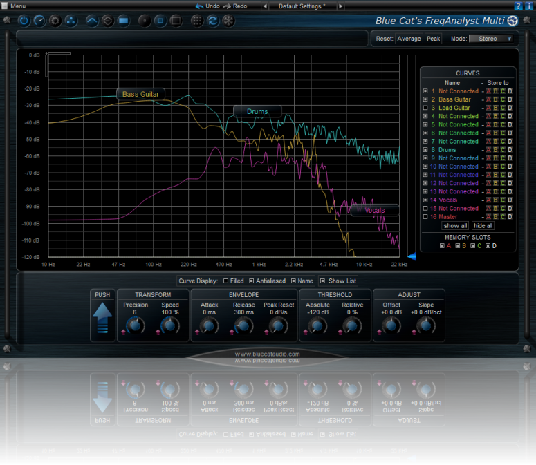 Blue Cat の FreqAnalyst Pro プラグインと同じように、周波数解析は細かく調整でき、各チャンネルには3 つのモードが用意されています。その複数のオーディオトラックのピーク、インスタント、アベレージレスポンスは同じグラフに表示することができます(プラグインは最高で16 カーブまでサポートしています)。ズーム機能と表示を調整することで、各オーディオトラックのスペクトラムの特性を正確に測定することができます。