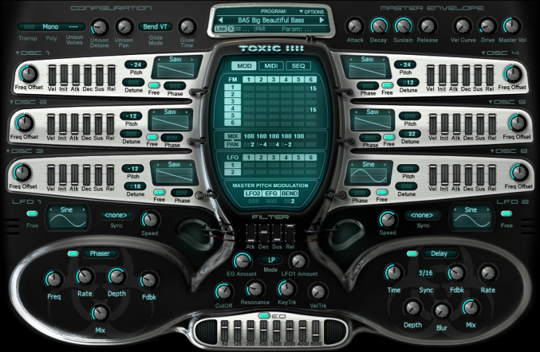 6系統のオシレータ、マトリクス式 FM/LFO、アナログモデリングフィルターフィルター、コーラス、ディストーション、マルチディレイ等のエフェクトも充実し、64ステップのシーケンサーも搭載した大型音源です。