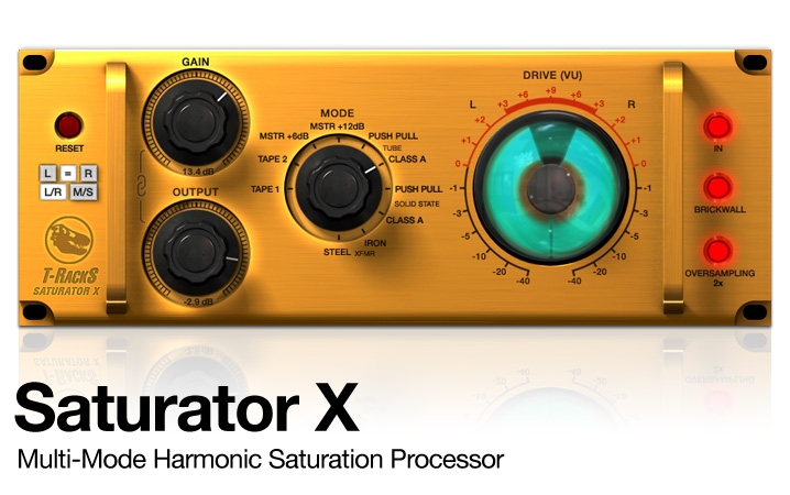 Saturator Xのユーザー・インターフェースは極めてシンプルで、直観的に操作することができます。10種類のサチュレーション・モードを備えており、シンプルなデザインながらもその自由度は極めて高いと言えるでしょう。DAWのプラグインとしても、T-RackS CSシェルのシグナル・チェインとしてもご使用いただけますから、幅広い目的での使用が可能です。
