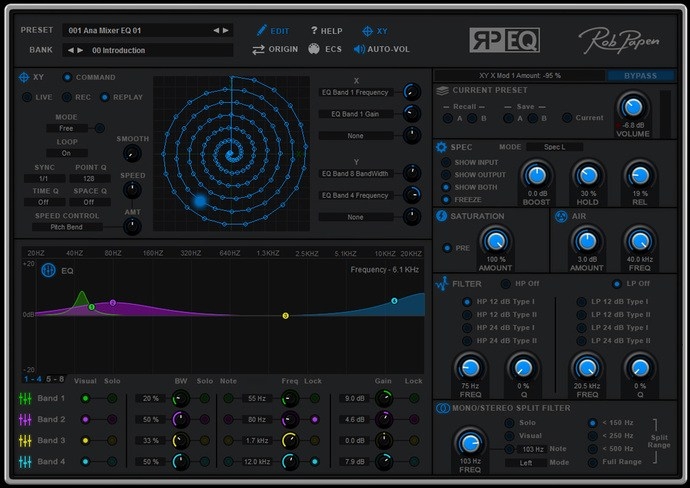 XYスクリーンは2つのプログラムLFOとして動作します。各方向へに移動することで、ダイレクトに一つ以上のRP-EQのパラメーターの値を制御します。 XYは Live(リアルタイム)/ Record(記録)/ Replay(繰り返し)の3つの基本動作があり、リアルタイムにマウスでパッドを操作して、XY値を決定。 XYパッドの動きはパスとして記録することが出来るので、Recordモードでパスを描画/記録します。記録されたパスはReplayモードでノートを演奏すると、記録されたパスに従って、XY値が変更していきます。 パスはプリセットの一部として保存されるので、パスの再現も容易です。