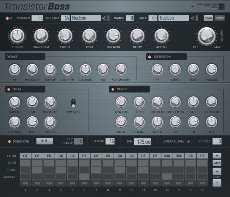 Bassline シンセサイザーに加えて、オリジナルのハードウェアにはないギターディストーション、FX、最新のシーケンサーなど、さまざまな改良を加えてコンセプトを強化しています。さらに、ベースラインシーケンスをすばやく編集できます。