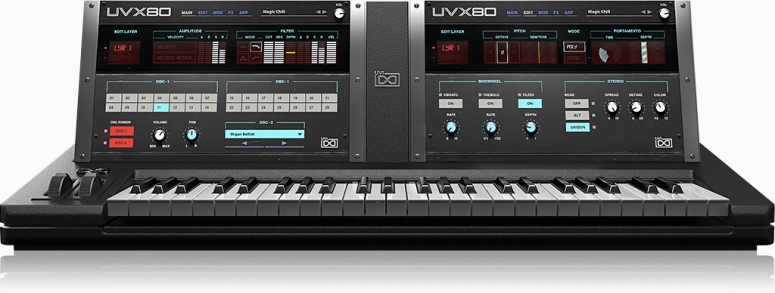 UVX80の操作画面は、実機を彷彿させるデザインになっています。実機同様、明快かつ扱いやすい設計になっています。2オシレーターのデュアルレイヤー構造では、オシレーター1に28、オシレーター2に111のサウンド波形プリセットが与えられています。そして、それぞれのレイヤーにマルチモードフィルター、ADSR、ピッチ、ポルタメント、ステレオ処理、アルペジエーターとモジュレーションホイールアサインが用意されています。さらに柔軟なLFOと16ステップのモジュレーターが、ダイナミックで複雑なサウンド変化を素早く操作します。最後におなじみの高品位のスタジオエフェクト:ドライブ、コーラス、フェイザー、ディレイとリバーブで音色を彩ります。