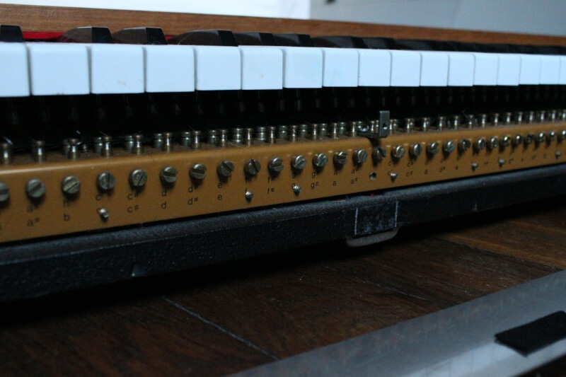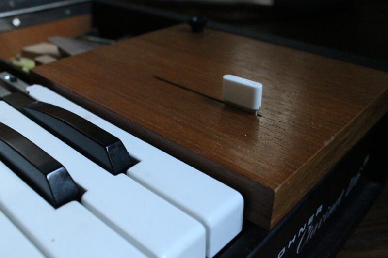 クラヴィネットは、5 オクターブ(60鍵)の楽器で、とてもシンプルな構造で動作します。鍵盤を押えるとギターのハンマーオンのように弦がブリッジに向かって押されます。そしてミュートされていない部分の弦振動がピックアップによってそのサウンドが増幅されます。
