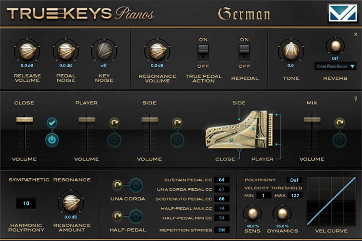 True Keys には3つのステレオマイクポジションが装備され、自由に選択またはミックスすることができます。また多くの優れたバーチャルピアノインストゥルメントと同じように、レゾナンスやペダル機能を装備し柔軟に設定することも可能です。その機能の充実さと自然さは業界の中でも随一と確信しています。それ故にこの製品を手にした方から True Keys Pianos はバーチャルピアノのニュースタンダードであると、称賛のお言葉を繰り返し頂いています。