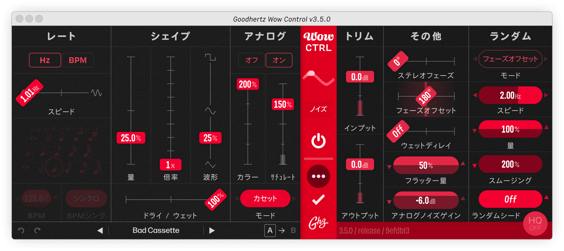 このWow Controlは、アナログテープをはじめとするアナログ機器特有の再生のモジュレーション(揺れ)に焦点を当てた新しいプラグインです。このWow Controlの開発では、自然な揺れを再現するために、30年に遡って3つのテープマシンの持つノイズや再生のふらつき、そして高調波の特徴などを正確に把握するようにしました。その結果として完成したプラグインは、これまで聞いたことがない、もっとも包括的なアナログテープサウンドのシミュレーションとなりました。