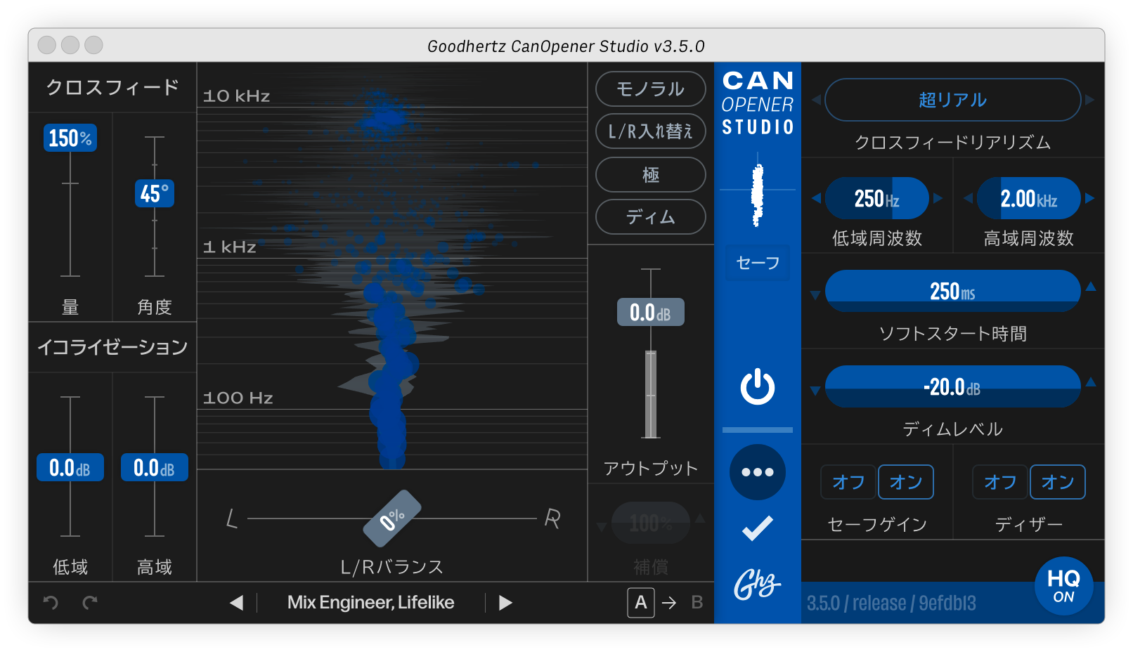 アウトプットの下に「補償」機能が付きました。これは、アウトプットのレベルが下がった際の高域や低域の損失を補償する値を設定します。=どのようなアウトプットレベルでも(正確にFrequency ResponseがFlatな状態で)モニタリングが可能です。