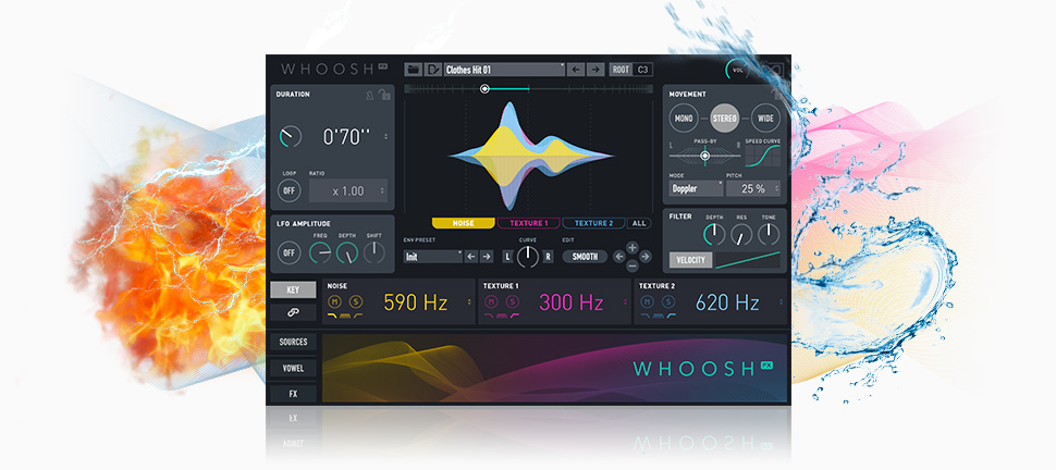 サウンドデザイナーによるサウンドデザイナーのために生まれたWhoosh FX、基本コンセプトは強力かつ効果的に動きと変化のあるサウンドエフェクトを明解操作で創造することにあります。長さを設定し、3つの独立したレイヤー:ノイズとテクスチャーを操作、いずれも豊富な種類を用意しました。特にテクスチャーサウンドにおいては、エアー、エレクトリカル、ファイヤーメタル、オーケストラル、ウォーター、ウィンドなどのカテゴリー別に収録し、目的のサウンドに最短距離で到達できるように設計されています。そしてエンベロープはマウスで描くだけでなく、プリセットから選択することもできます。さらに動きを加え、ドップラー効果を調節し、モーフィングバウエルフィルターを駆使して変化を加えます。最後にスタジオ品位のエフェクトプロセッサー:コンボルバー、デジタルEQ、ディレイ、iRリバーブ、リミッターなどで仕上げをします。Whoosh FXは奥深い機能と直観的で扱いやすい画面を融合し、モーショングラフィックス、テレビ、フィルムと同期した効果音で豊かにし、音楽の中に動きのある要素を効果的に加えることが可能です。