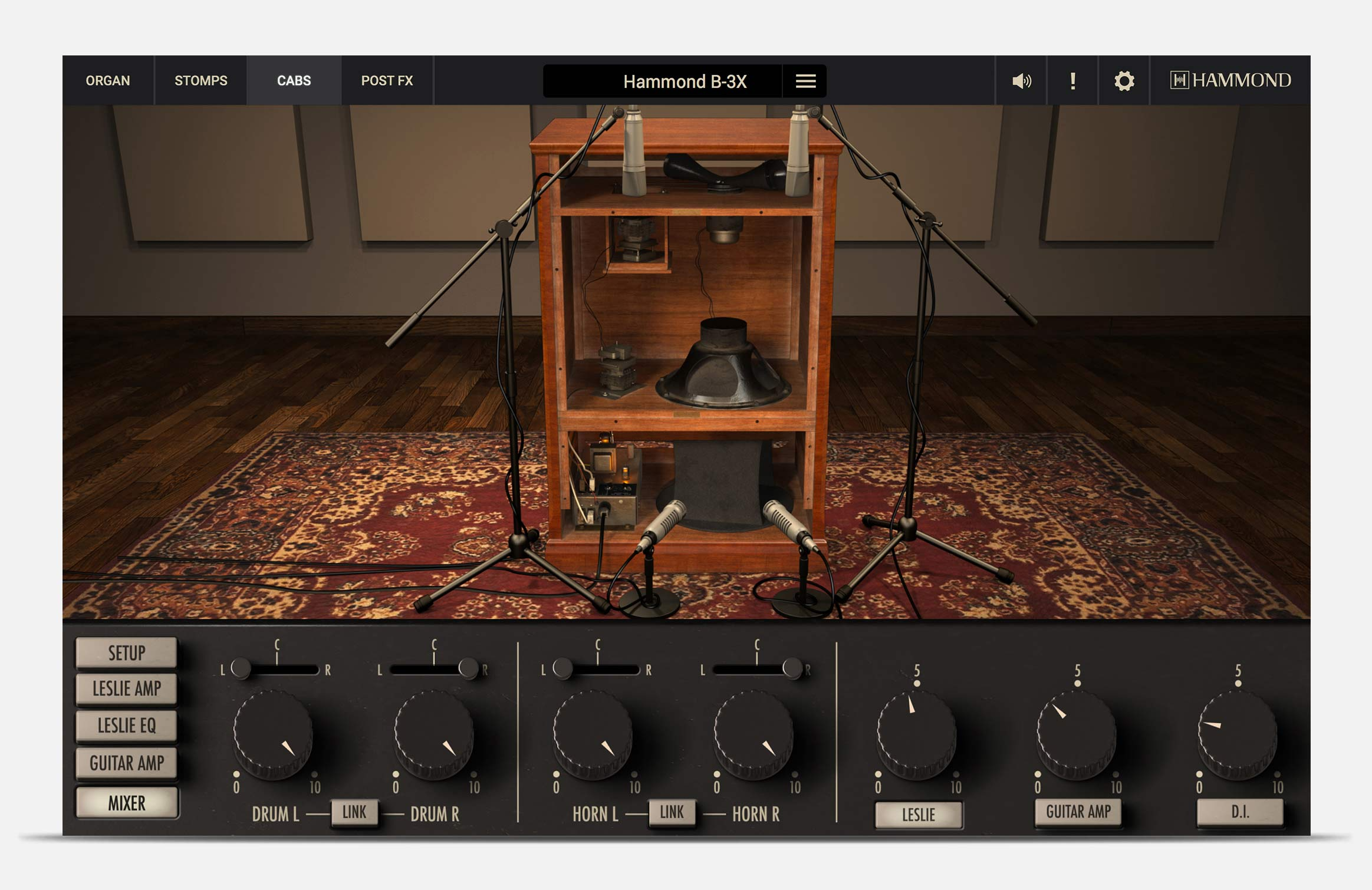 CABSセクションでは、Leslie® Collectionで培ったレスリー・ユニット・モデリングと、AmpliTube 4から抜粋されたギター・アンプ、キャビネット・モデリングが使用可能。実際のレスリー・ユニットやギター・アンプと同様のサウンド・メイクを実現しています。ミキサーで、レスリーとギター・アンプ、そしてD.I.サウンドのミックス・コントロールも可能です。