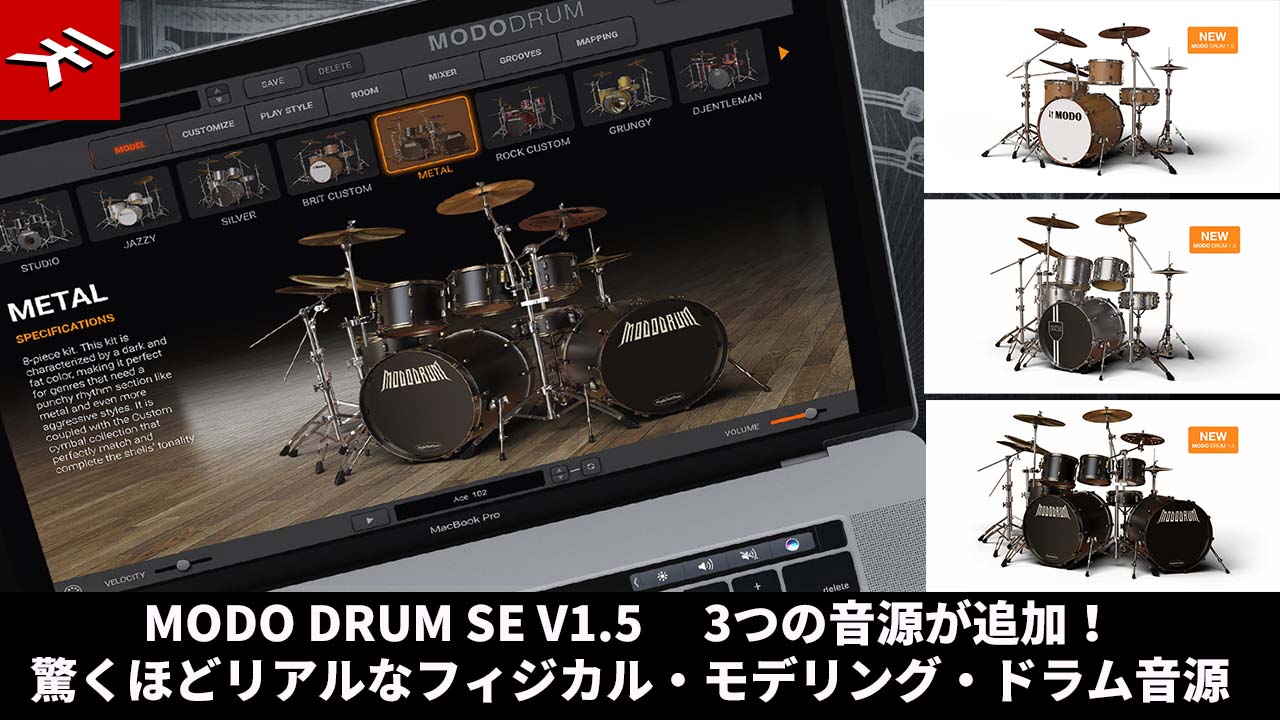 史上初のフィジカル・モデリング・ドラム音源 V1.5に更新され、3つの新作キットと対応シンバルを追加